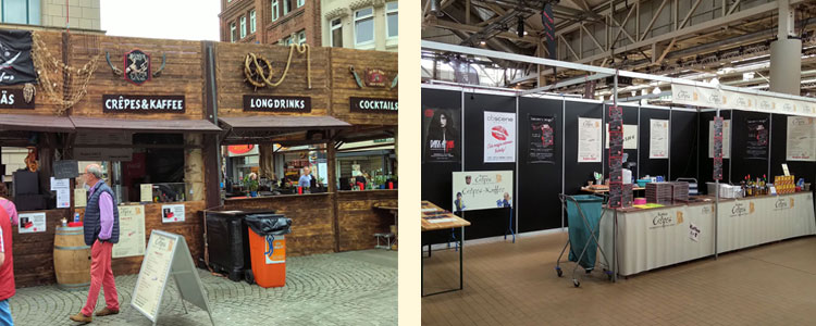 Zum einen, (links oben) mit einem eigenen Zelt (6 x 3 Meter) und vier einzelnen Tischen als Tresen, dann können im Zelt zwei Bierzeltgarnituren untergebracht werden, oder (rechts oben) mit einem Verkaufshänger (Breite 220 cm x Länge [inkl. Deichsel] 480 cm). Wenn Sie einen "Raum" zur Verfügung stellen, weil es besser in Ihr Konzept passt, dann kann ich auch eine (links unten) Holzbude, hier Kieler Woche 2022, oder (rechts unten) einen Messestand beziehen, und von dort meine leckeren Crepes anbieten.