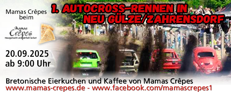 Mamas Crêpes wird am 20. September bei einem nigelnagelneuen Event dabei sein. Autocross Rennen in Neu Gülze/Zahrensdorf. Ich bin sehr gespannt, wie das wird. Ab 9 Uhr geht es los. Kommt zahlreich, und lasst diese neue Veranstaltung ein Erfolg werden, das wird es im nächsten Jahr weiter gehen!